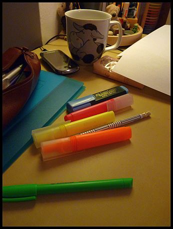 Wenn ich dieses Bild mir so anschaue, werde ich doch neugierig darauf, wie die Schreibtische bei anderen Menschen so aussehen... Man müßte einen Aufruf an die Blog-Community starten "Zeigt her Eure Schreibtische" (bitte vorher nicht aufräumen)